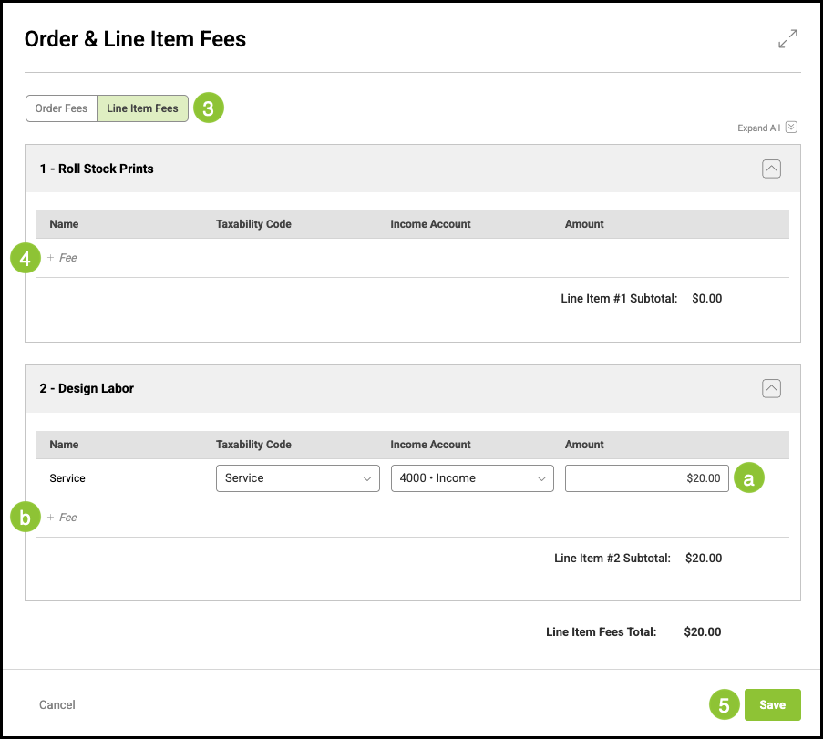 Note: When working with Line Item Fees, an additional field labeled Per Item Fee will be available.