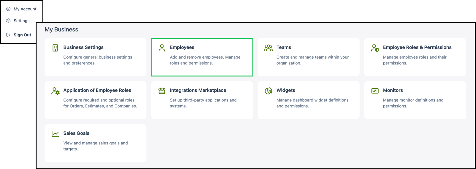 Answer: Once the Employee profile is created, select the Employee from the list found in Settings / My Business / Employees. In the Employee Roles section, click Manage and View Permissions. You can adjust what areas of the system they can access based on their role. To grant system access, use the Online Access section and select Enable Online Access.