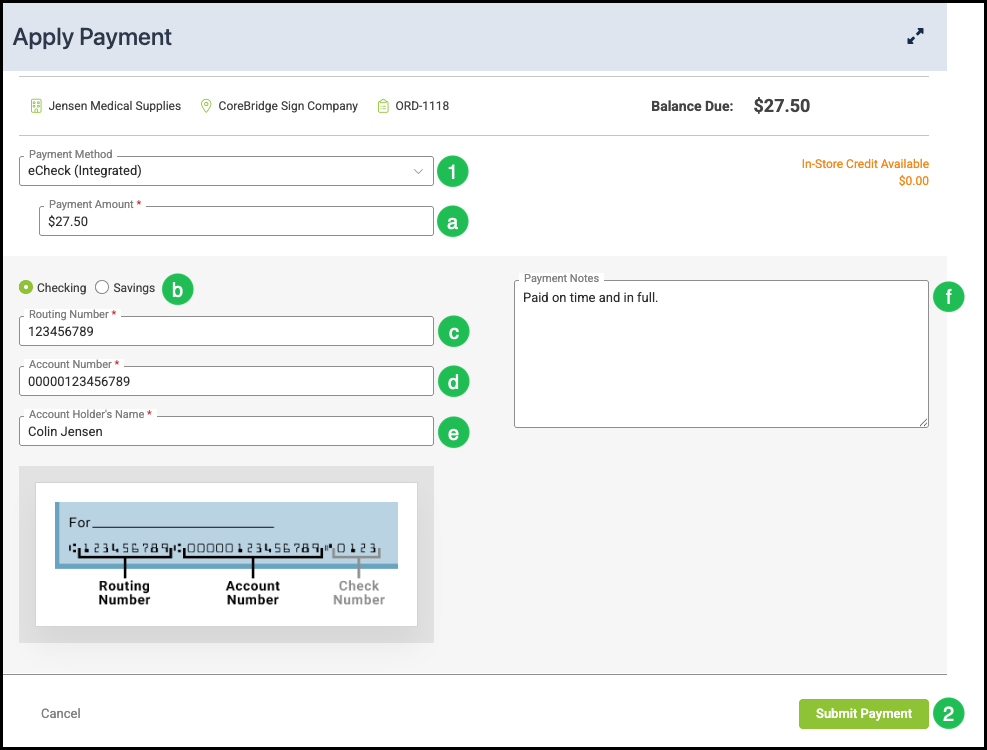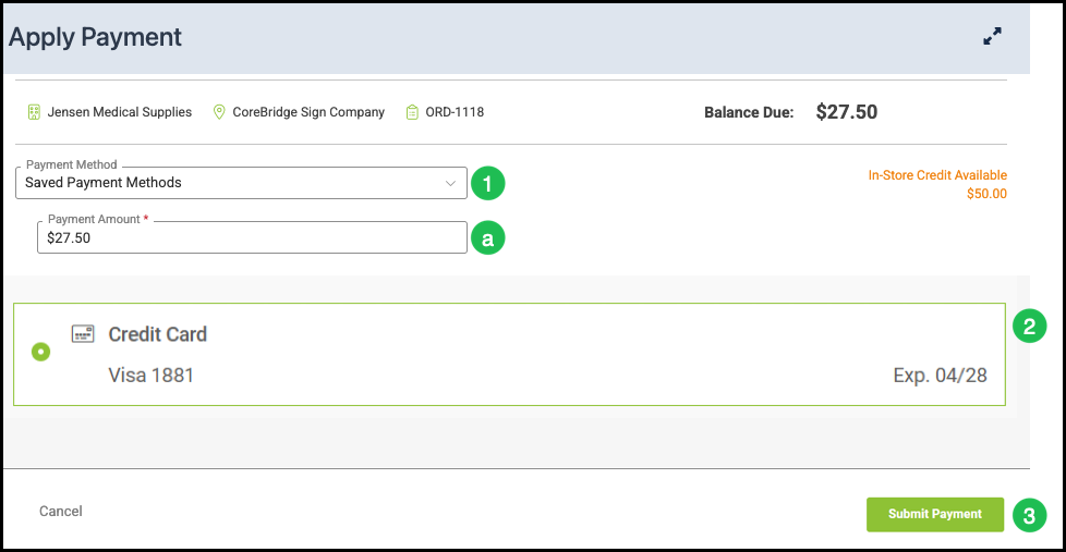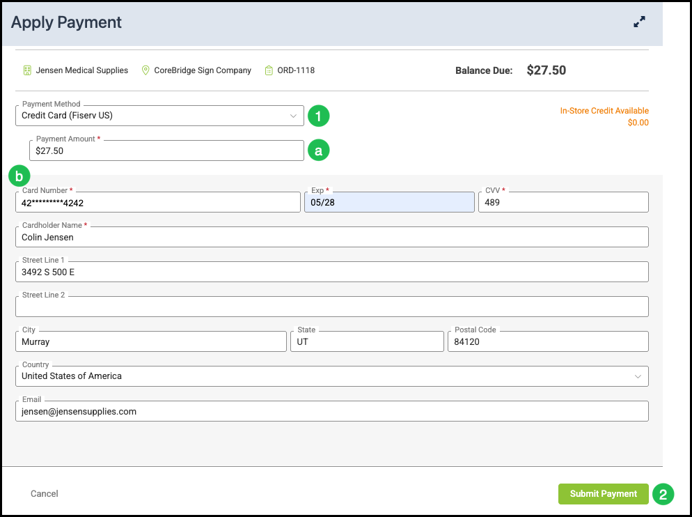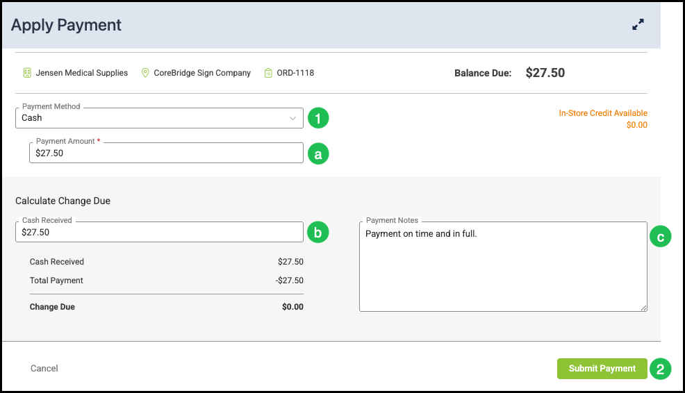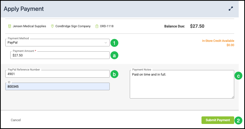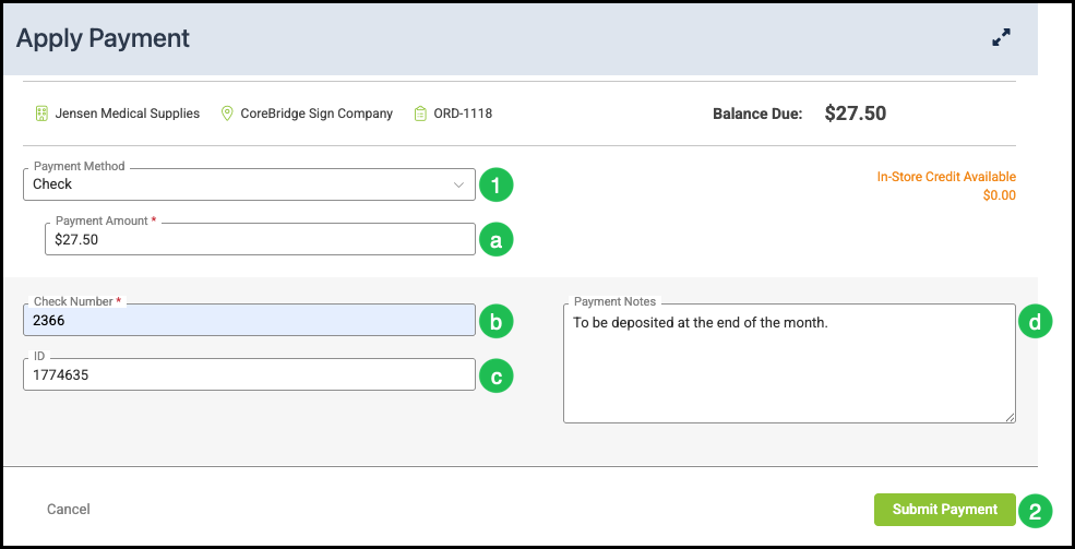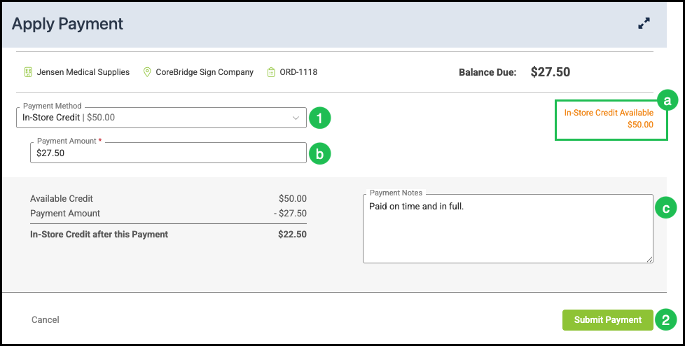 b. Payment Amount - The amount to apply. The system will reduce the Customer's In-Store Credit balance by this amount.