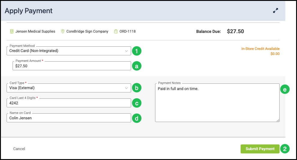 Use Credit Card (Non-Integrated) when the card is processed outside of CoreBridge (for example, through a separate terminal or processor). You record the payment in CoreBridge for your records.