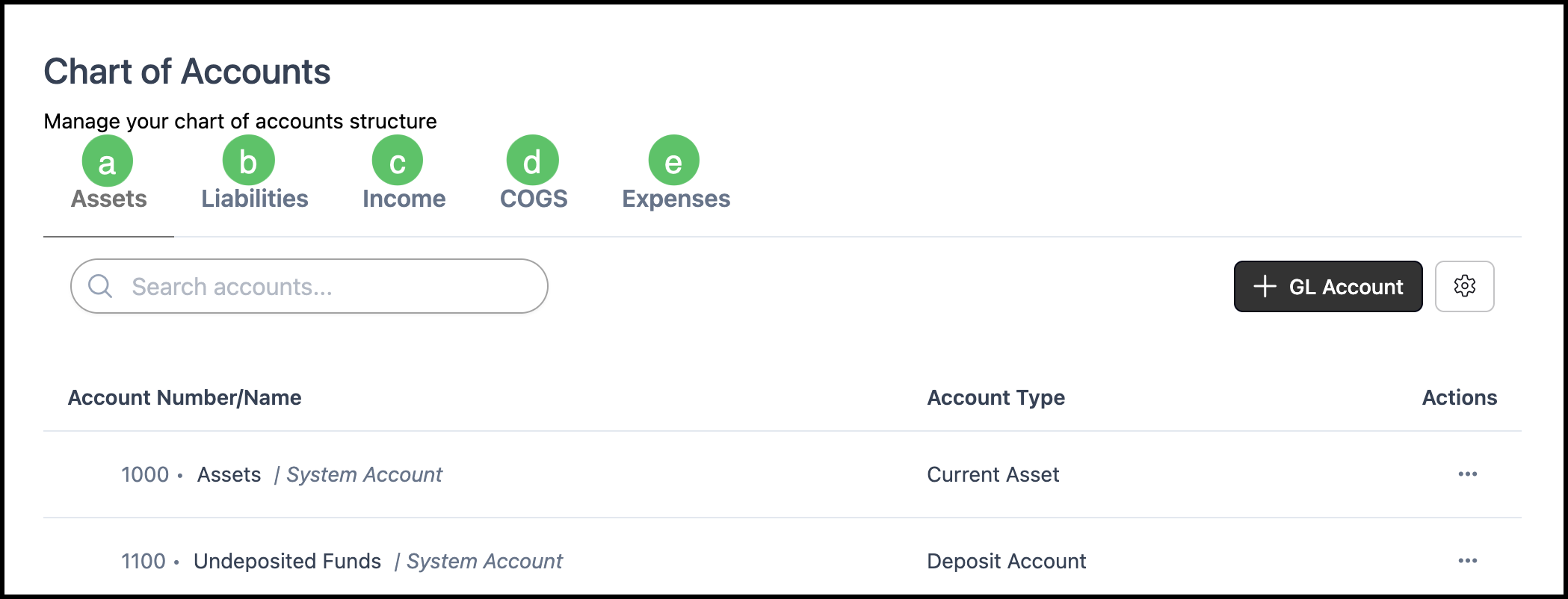 The Chart of Accounts screen is made up of five tabs that list the five types of accounts in the system.