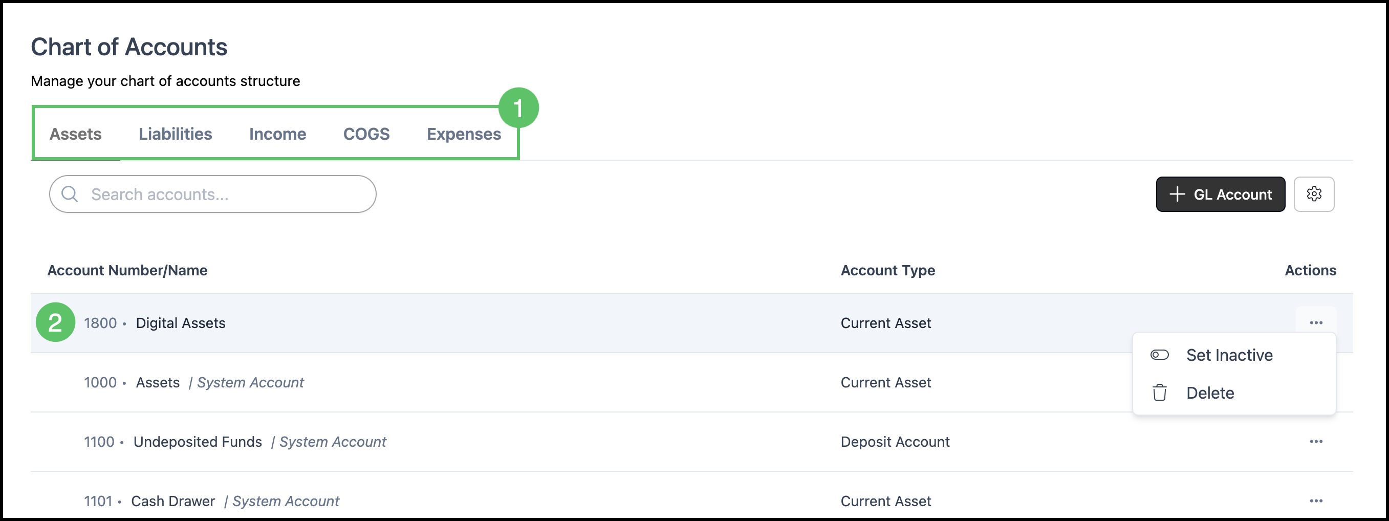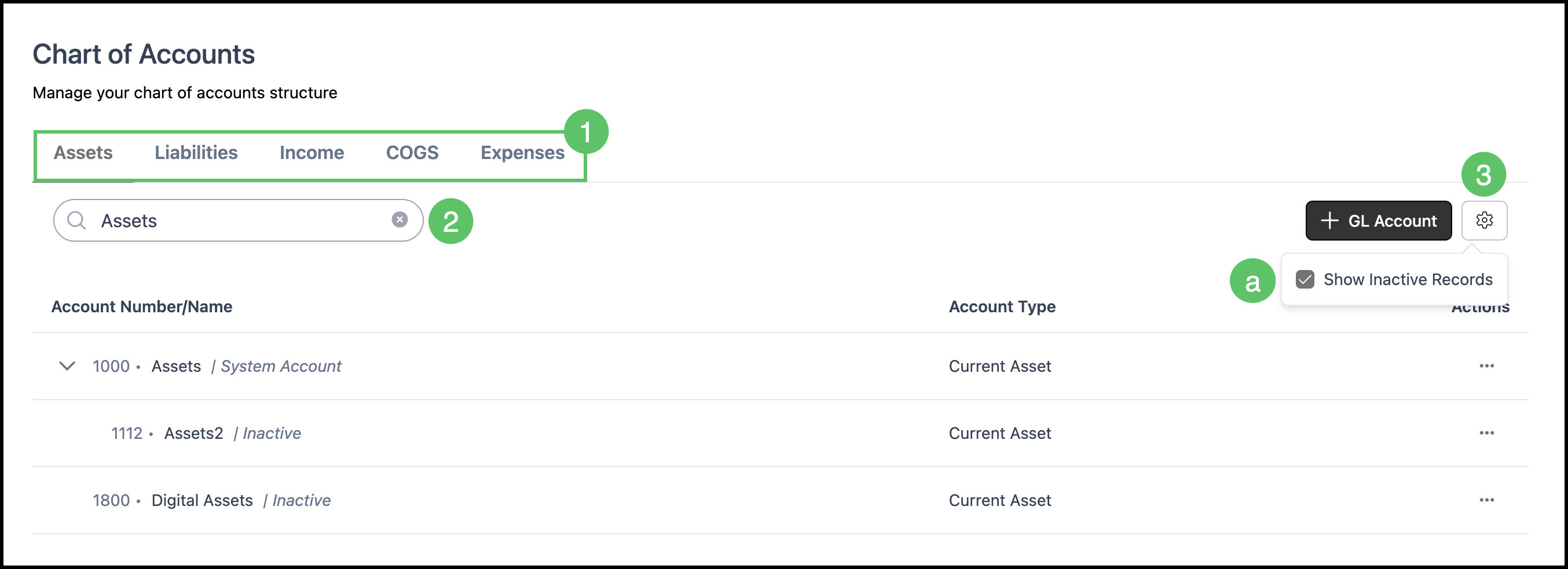 2. In the search box, enter a keyword to search. This will filter the chart of accounts for that Account Type.