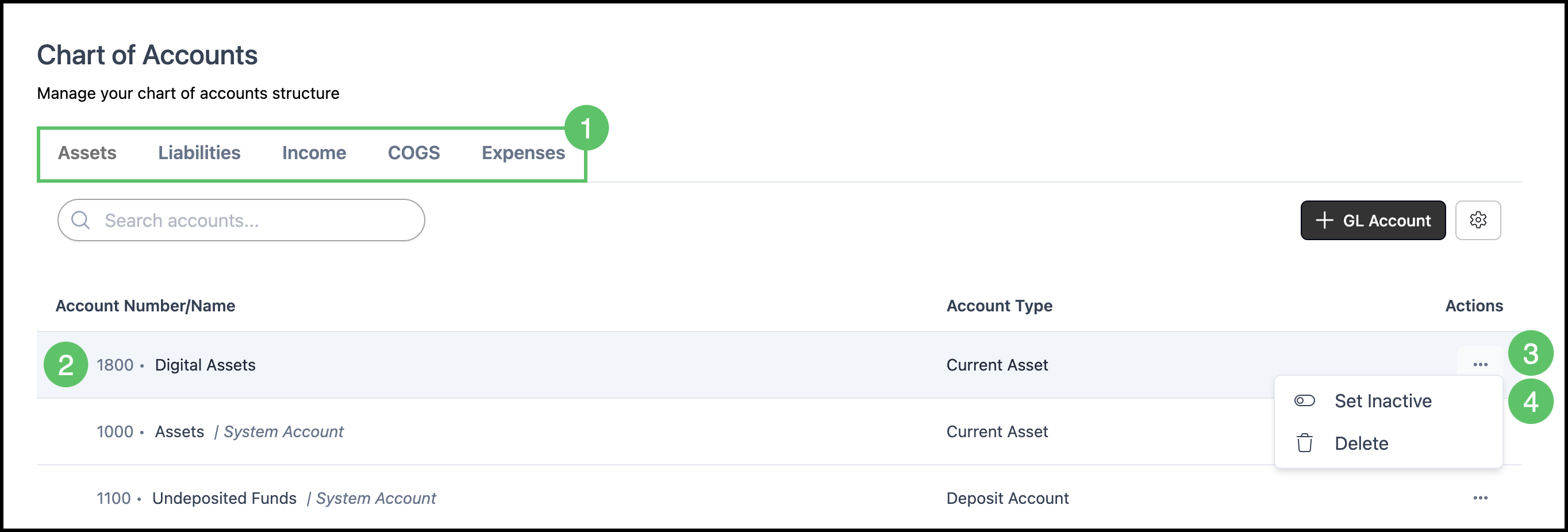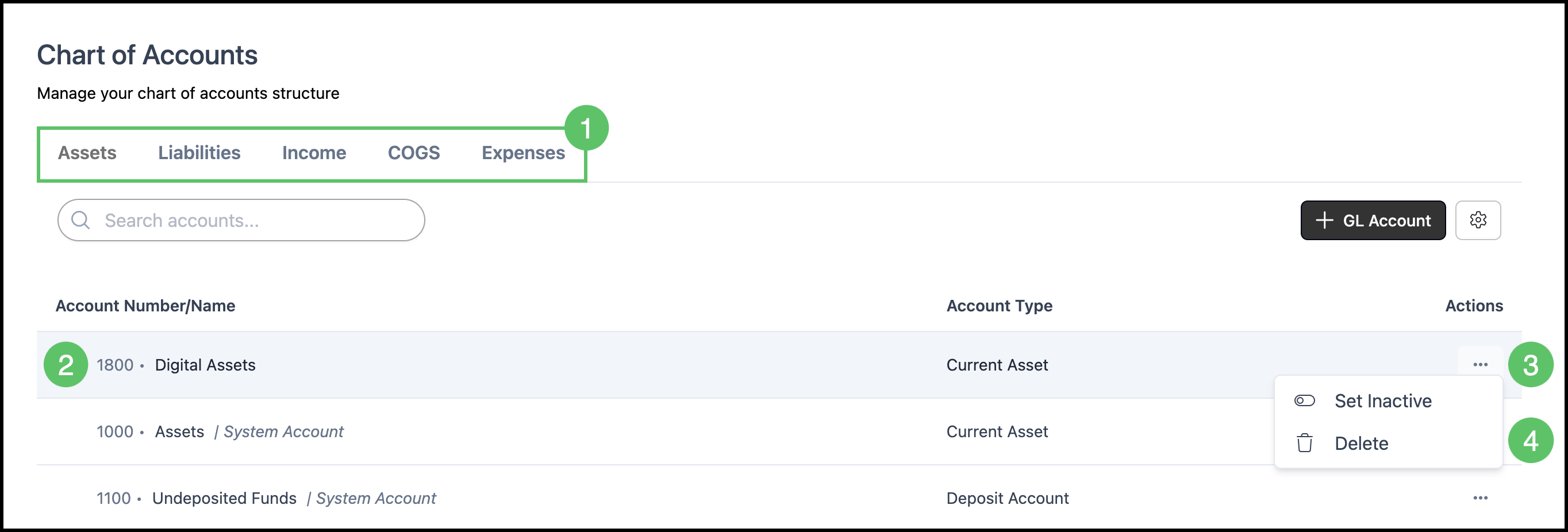 Note: Only custom accounts can be deleted. The Delete option may be disabled if the account is in use or has subaccounts.