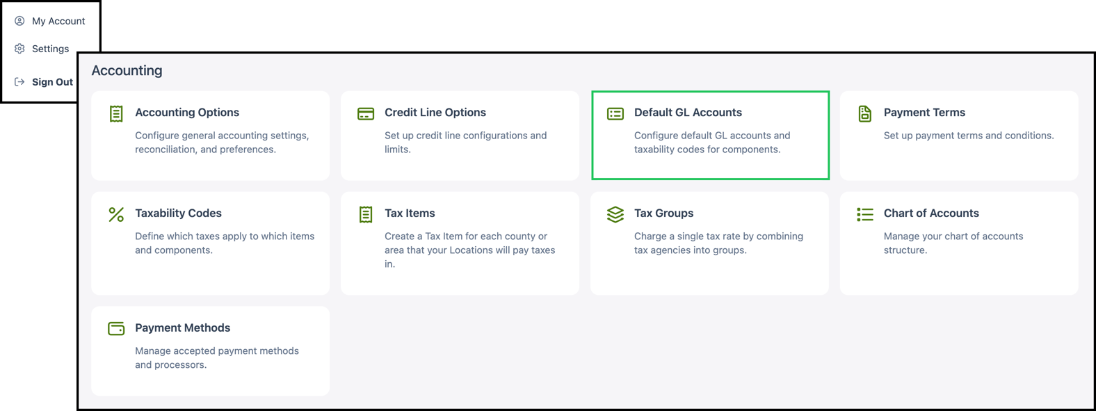 The Chart of Accounts provides a structured framework for organizing and categorizing financial transactions. Default General Ledger (GL) Accounts are specific accounts selected from within the Chart of Accounts and assigned to commonly recurring transactions or system processes. These act as predefined destinations for financial entries, reducing manual data entry and ensuring consistency. For more information on chart of accounts, please see Managing Chart of Accounts