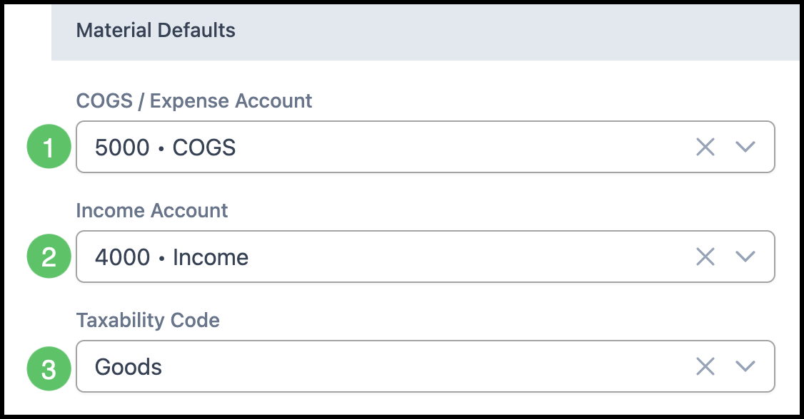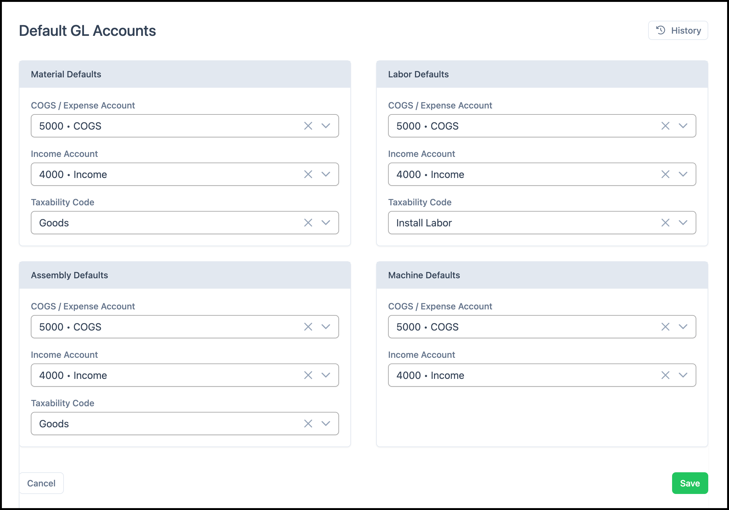 Setting up Default General Ledger Accounts for material, labor, machine, and assemblies ensures that when new components are added, income and expense are properly allocated for each component. Taxability codes are defaulted by material, labor, and assemblies to default how a component will be taxed.
