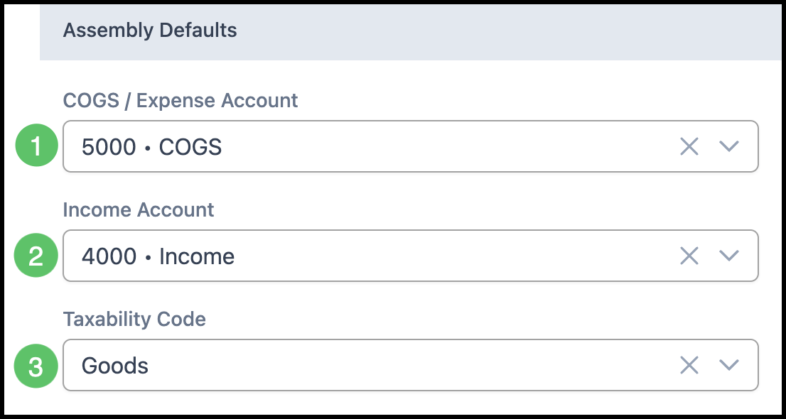 Assemblies are the products produced by adding together material, labor, and machines. These accounts will be the default when new assemblies are created in the system.