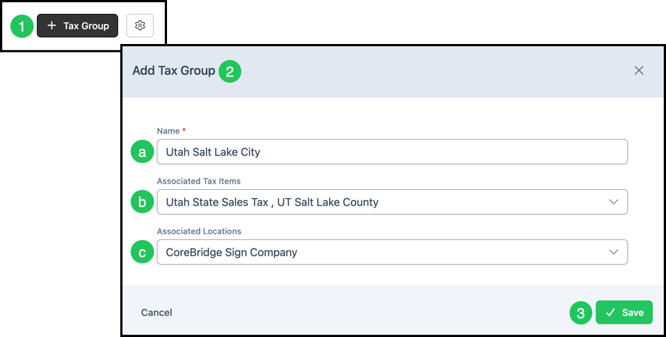 b. Associated Tax Items - The Tax Item(s) that apply to this Tax Group. The Tax Group total will be the combined tax visible on a Customer's Estimates and Invoices.