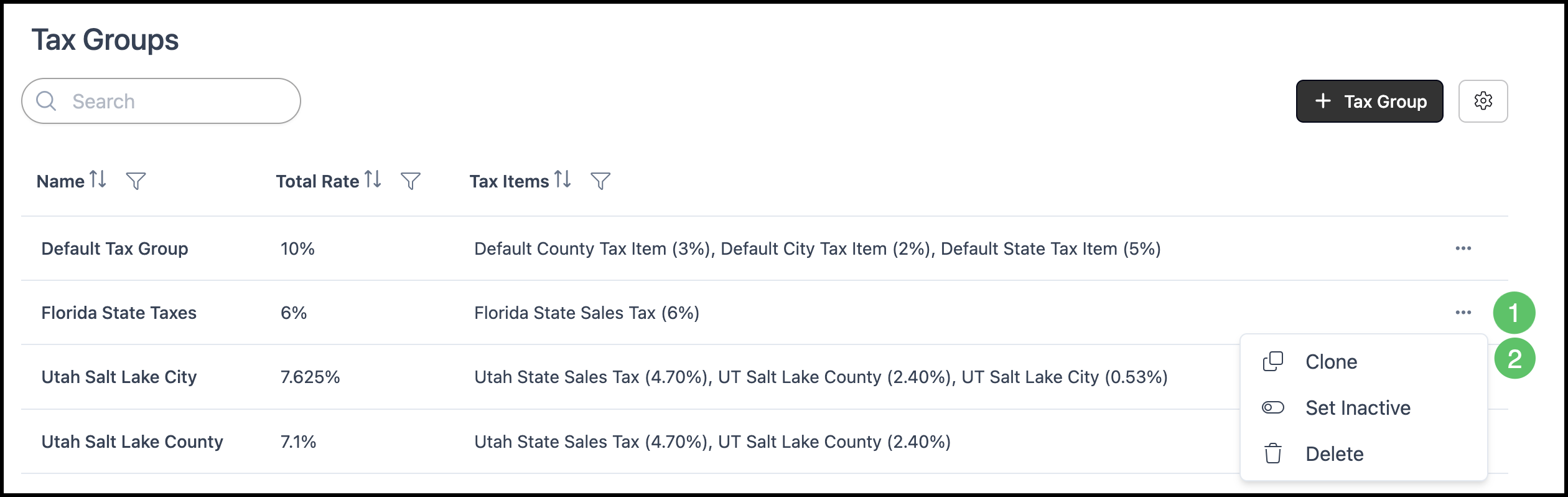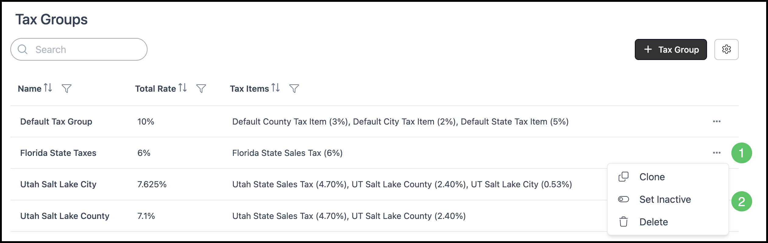 1. Find the Tax Group in the list and click the Actions button for that row.