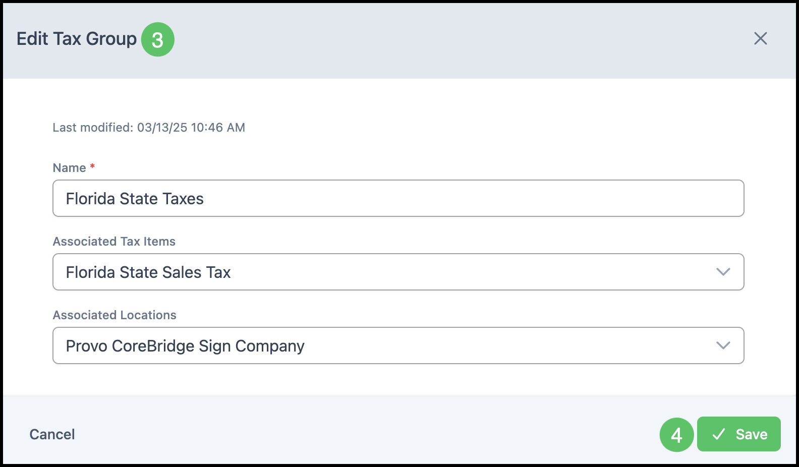 3. Change the Tax Group details as needed (Name, Associated Tax Items, and Associated Locations if available). Ensure required fields are completed.