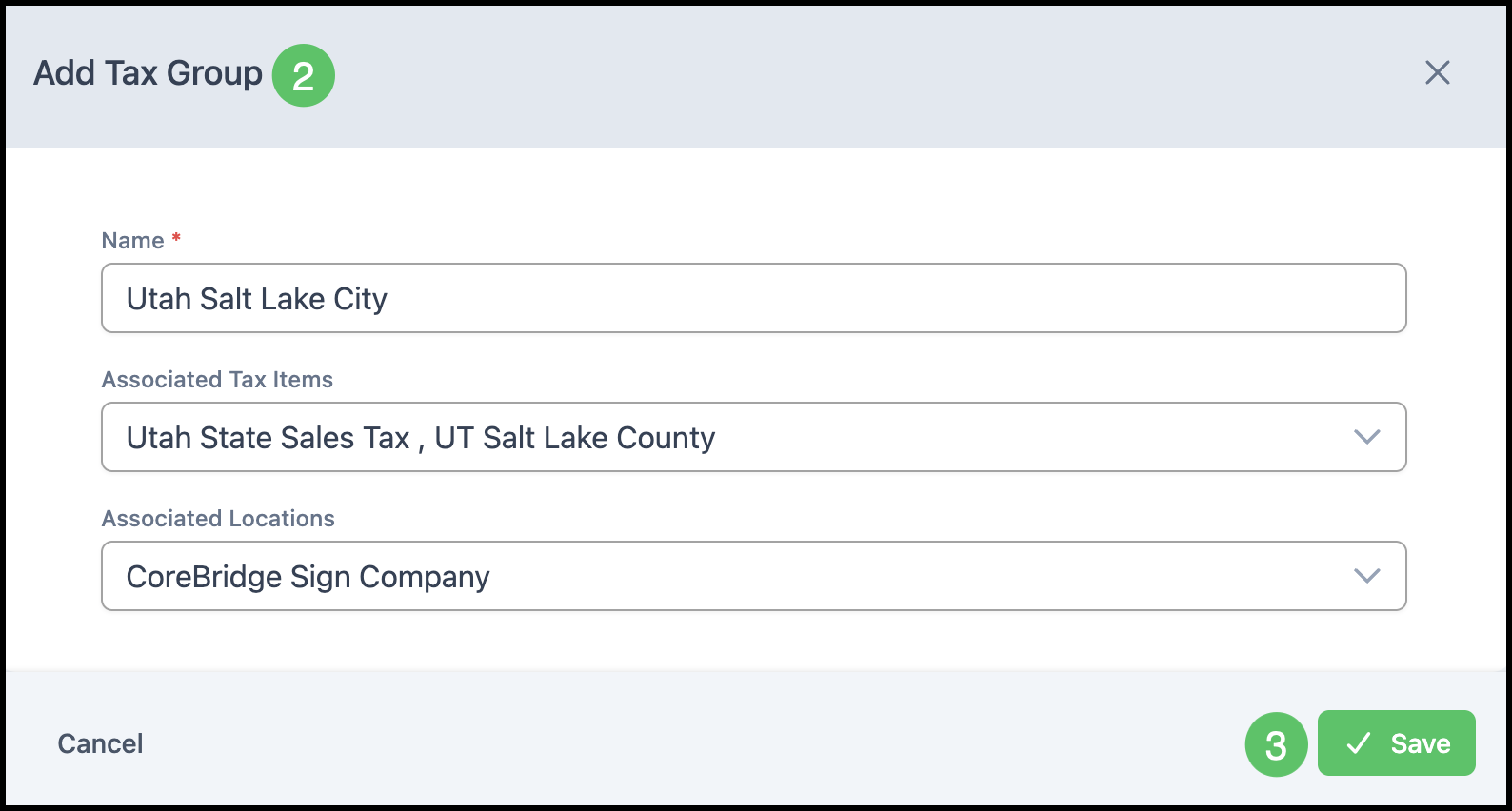 2. The Tax Group dialog will open. Update any Tax Group details. Fields marked with a red asterisk are required.