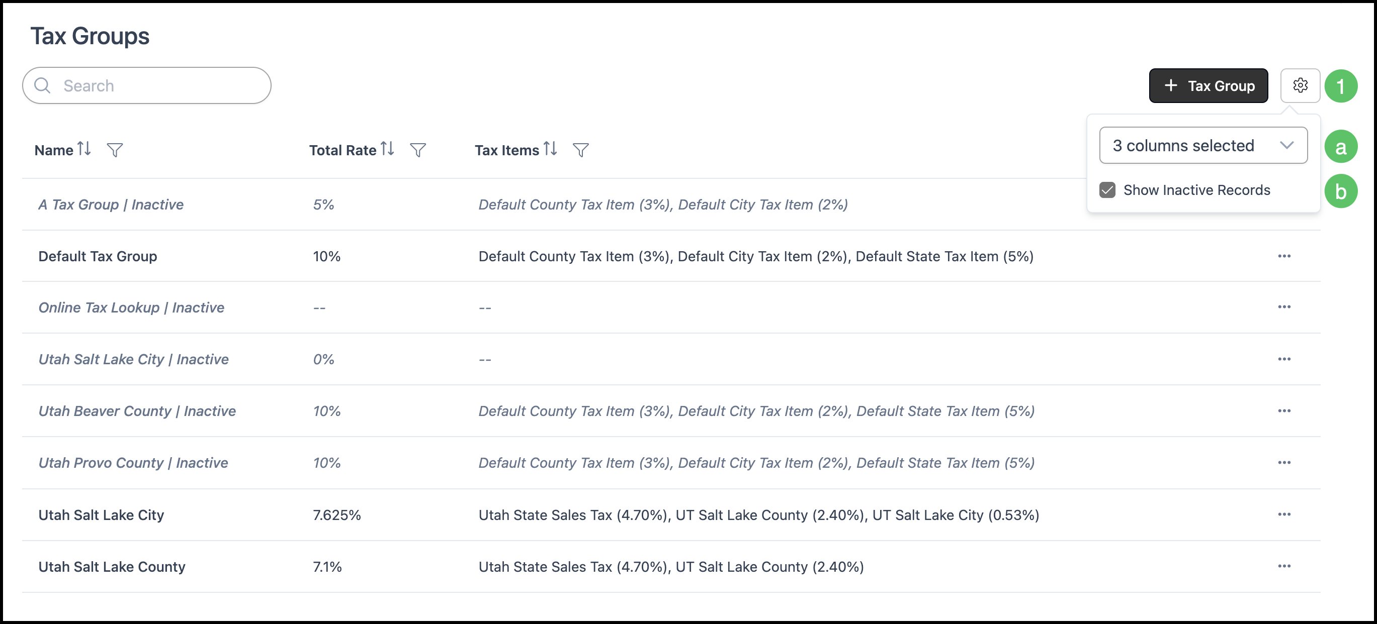 a. Column selection - Use the column selector to choose which columns are displayed in the list (for example, Name, Total Rate, Tax Items). Select or clear columns to show or hide them in the list.