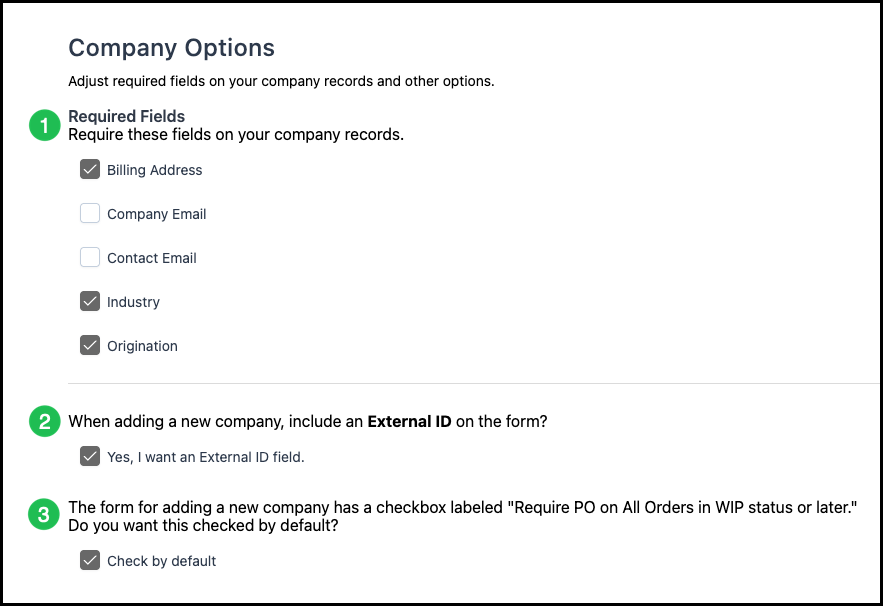 1. Under Required Fields, select which fields must be completed for all future Company records.