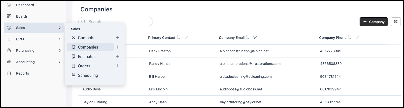 Note: The Company email and phone may be different from the Primary Contact email and phone. A Contact can be the Primary Contact for multiple Companies. You can add more Contacts and change the Primary Contact after the Company is created.