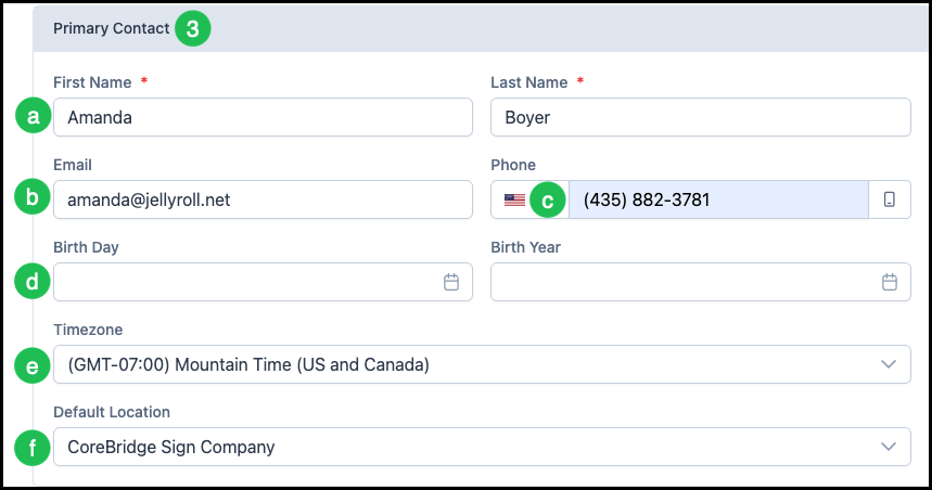 d. Phone - Enter only numbers; the system will format the number based on Settings / System / Localization.