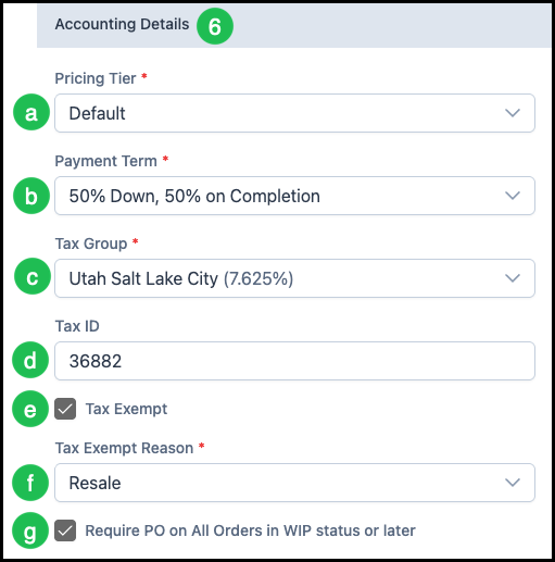 e. Tax Exempt - Choose whether or not you want this company’s estimates/orders to always be Tax Exempt by default, and if so, add a Tax Exempt Reason.