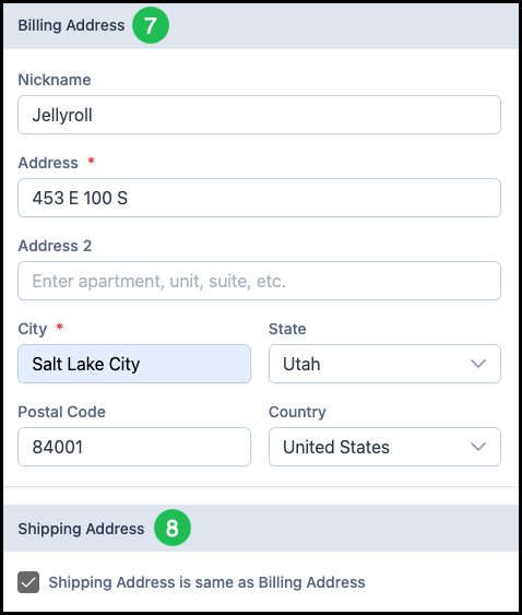 7. Enter the Billing Address (Address, Address 2, City, State, Postal Code, Country, and optional Nickname).