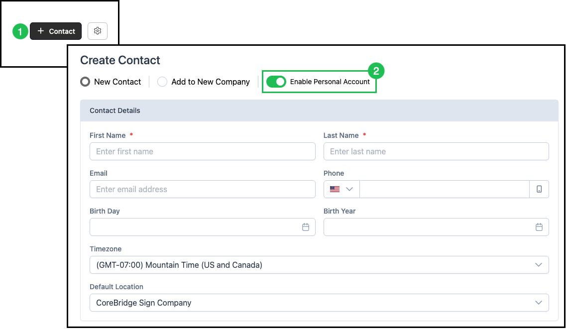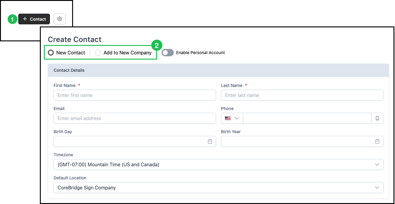 - Add to New Company - Create both a new Contact (as the Primary Contact) and a new Company in one step. The form will include Primary Contact details, Billing Contact (same as Primary or separate), and Company Details.