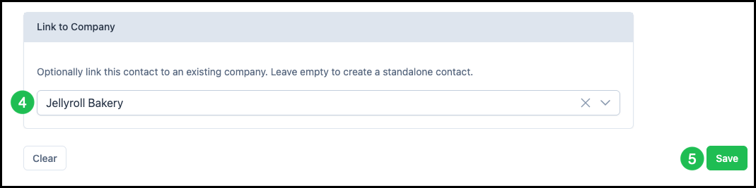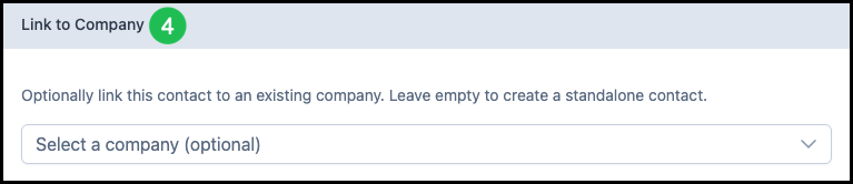 4. Use Link to Company to optionally select an existing Company. Leave this empty to create a standalone contact (no Company linked).