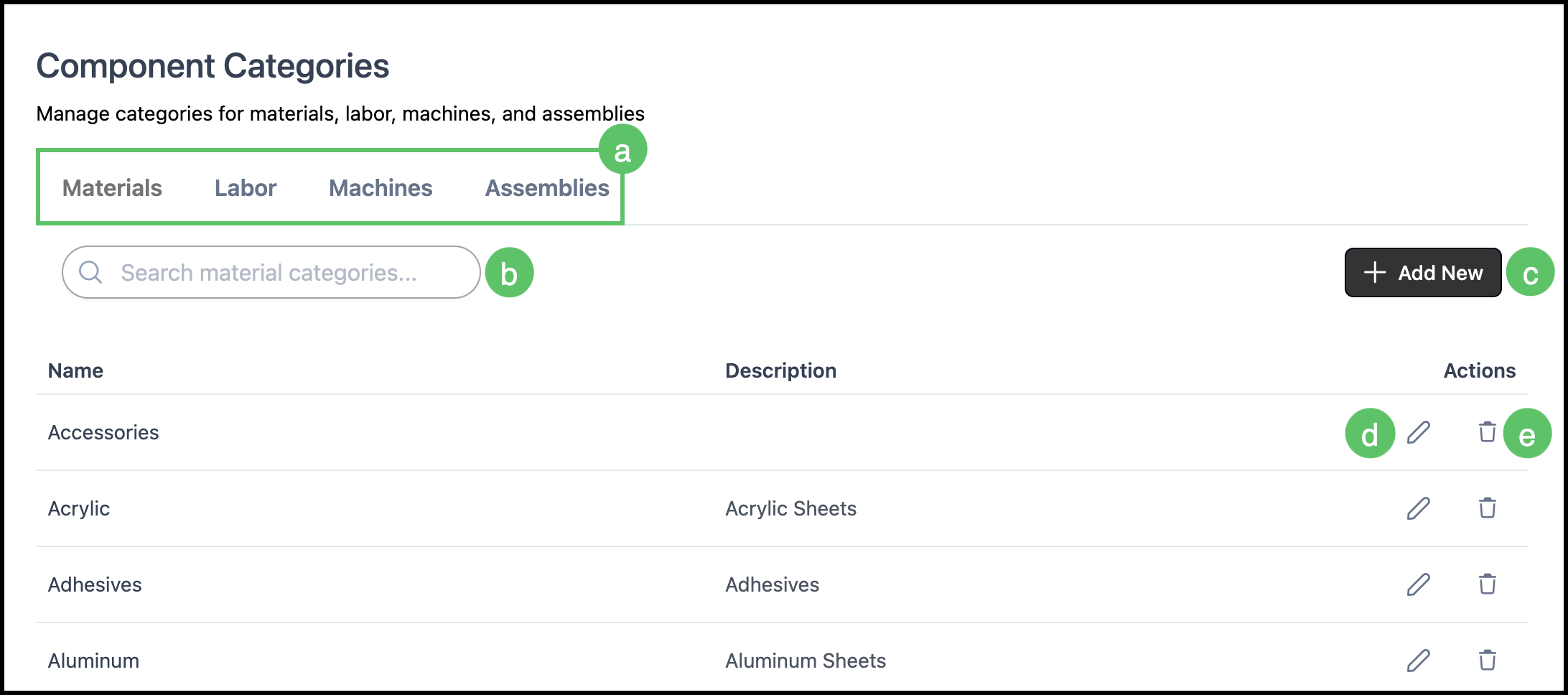 Component Categories are predefined classification labels used to organize different types of Components - such as Materials, Labor, Machines, and Assemblies - within your system. They act as grouping mechanisms that help structure your component database, making it easier to sort, filter, and select items during Estimate and Order creation, and Assembly-building workflows.
