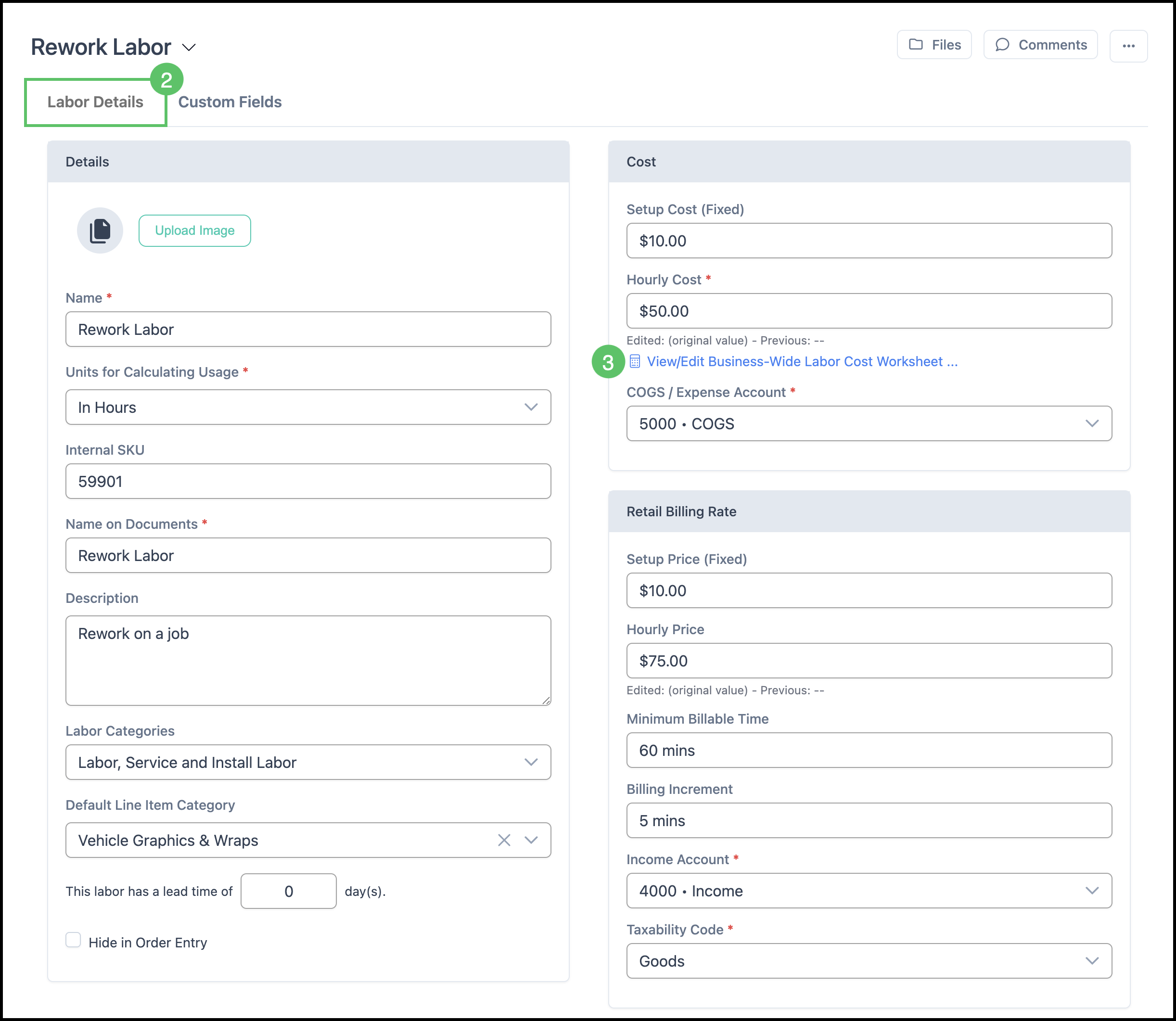 The Labor Cost Worksheet is accessed from the Labor record and is used to help you determine an accurate hourly cost for that Labor.