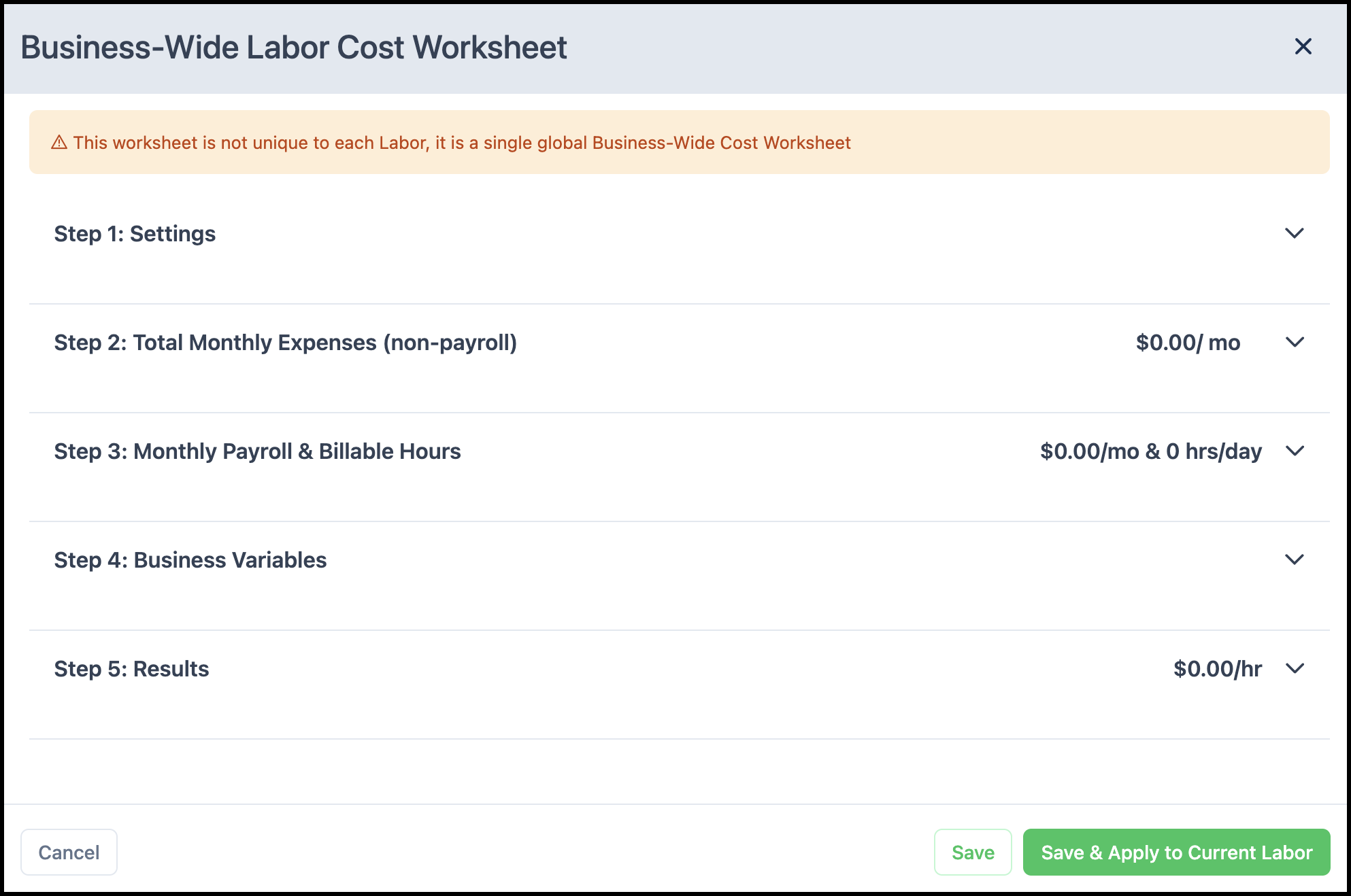 The Labor Cost Worksheet is a business-wide tool used to calculate the average hourly cost of Labor across your Company. It is not tied to a specific Labor type, but provides a general rate that applies system-wide. This section is intended to help you understand how to complete the worksheet accurately.