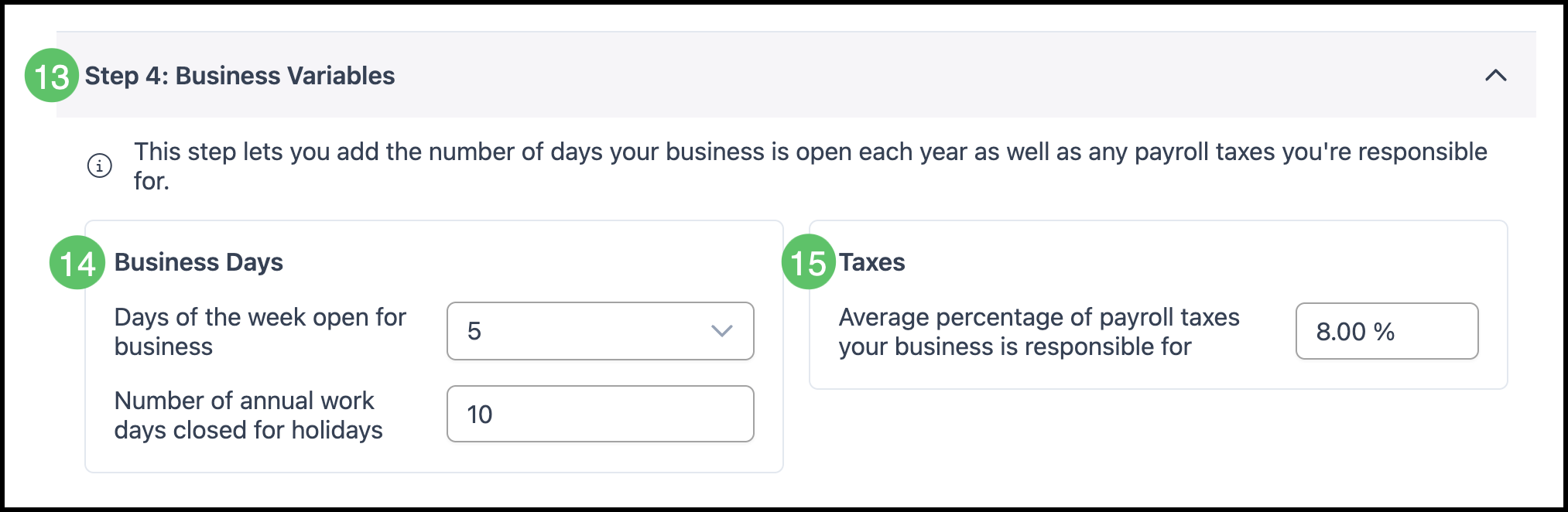 14. Enter in the number of days each week that you are open for business and the number of work days that you are closed for holidays each year.