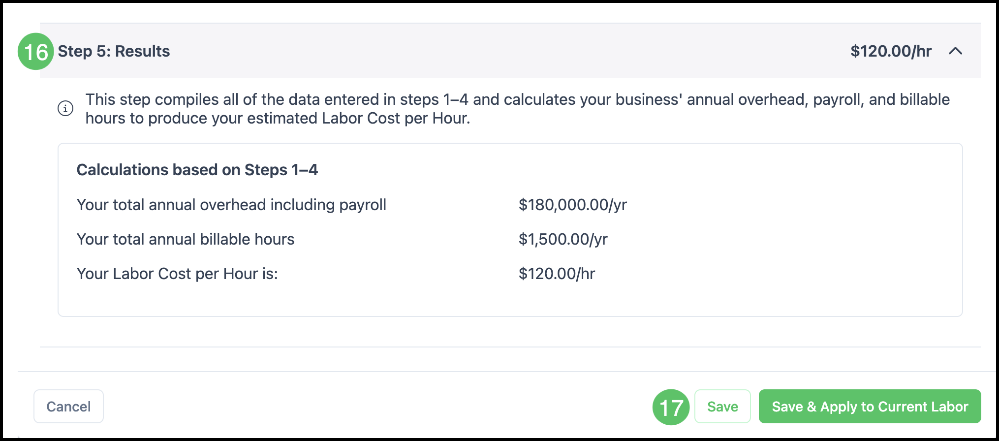 16.  Open Results by clicking the bar to expand. This is the Labor Cost per hour based on the information entered in the previous steps.
