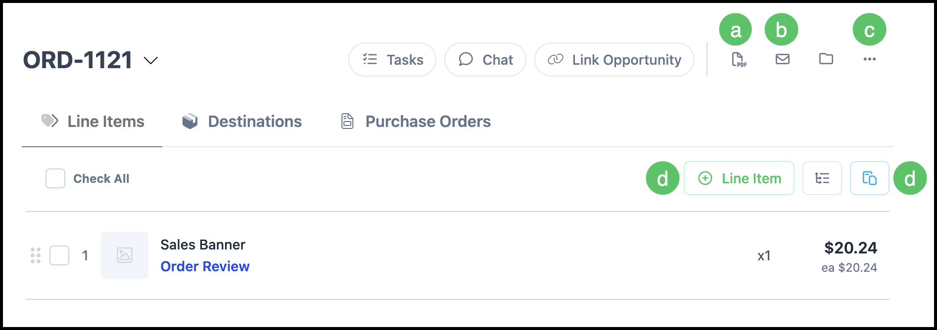 d. Line Items can be added with the Add Line Item icon or from the Clipboard icon.