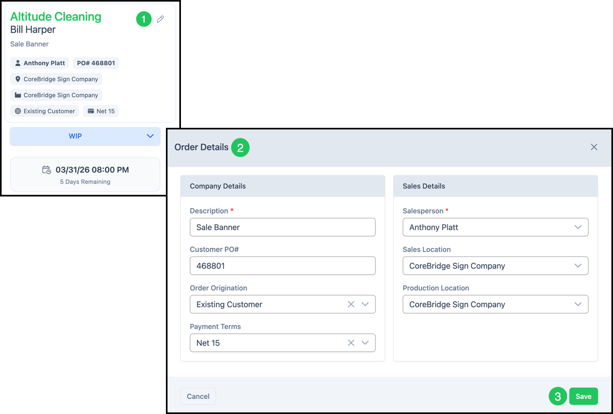 Orders can be edited at any time after they are created. You can adjust Company and Sales information, update due dates, and manage the Roles associated with the Estimate. For more information, please see Employee Roles and Permissions in Settings.