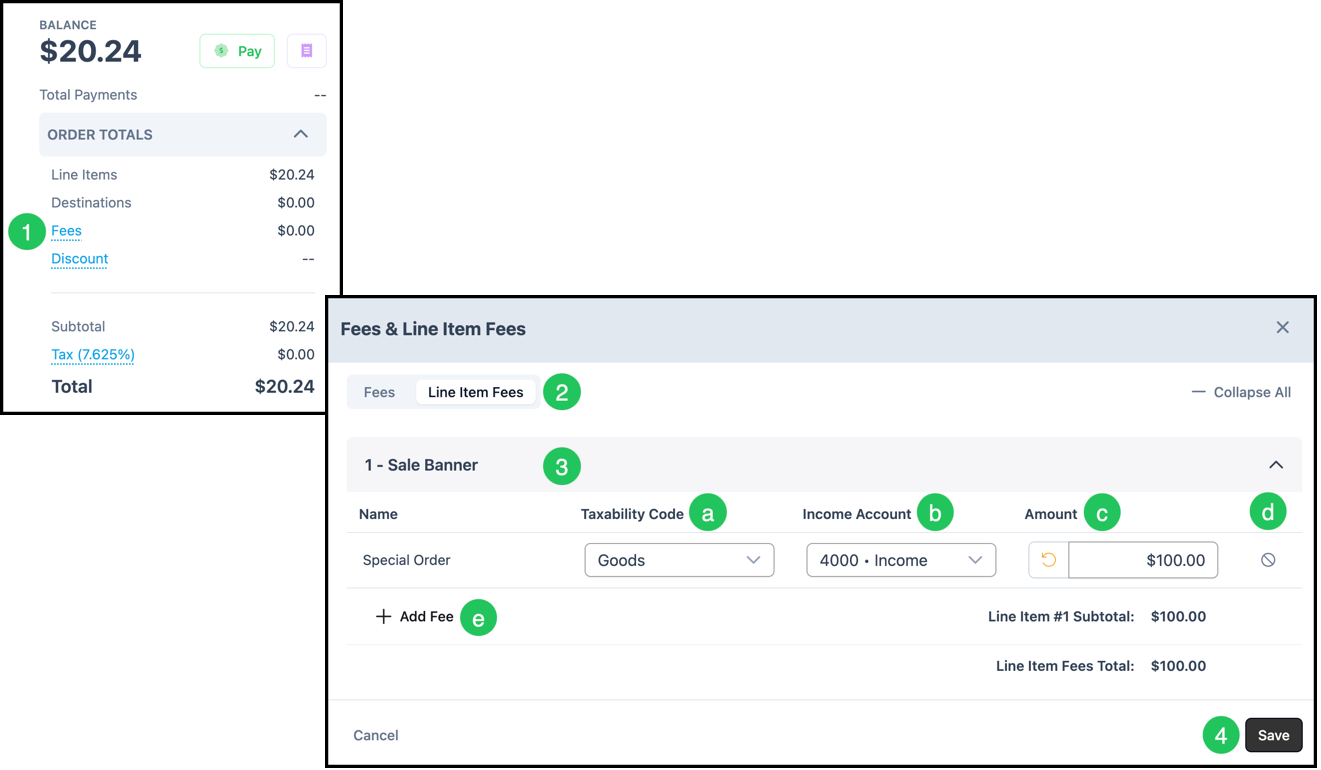 Note: Order and Line Item Fees can be managed in Settings / Sales Settings / Order & Line Item Fees.