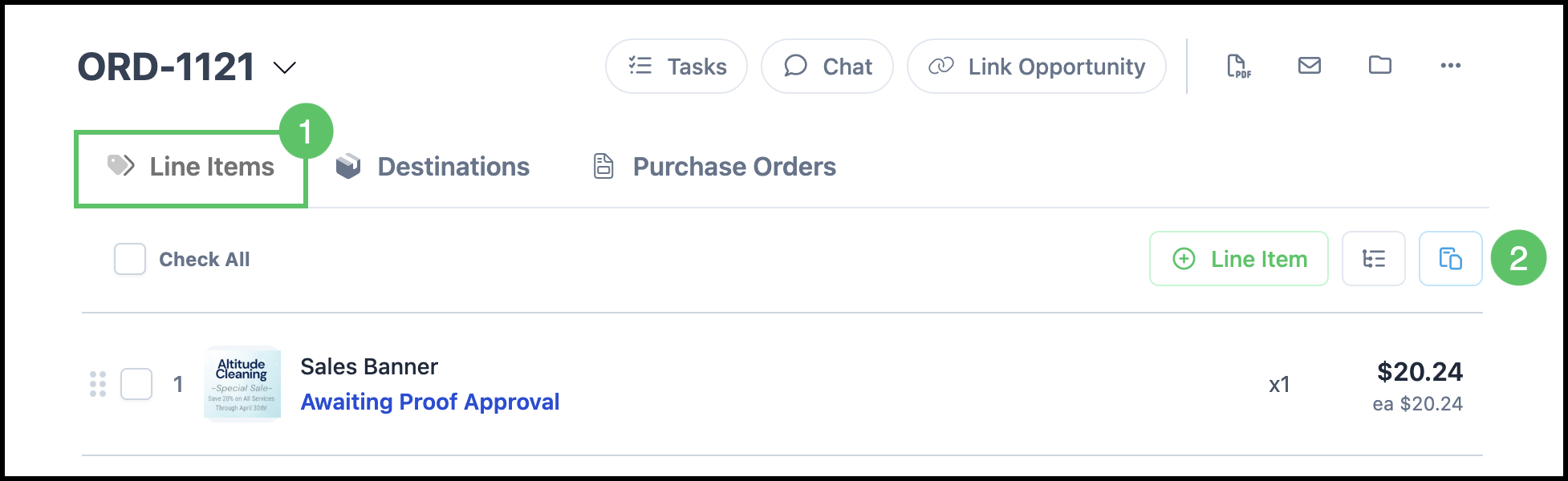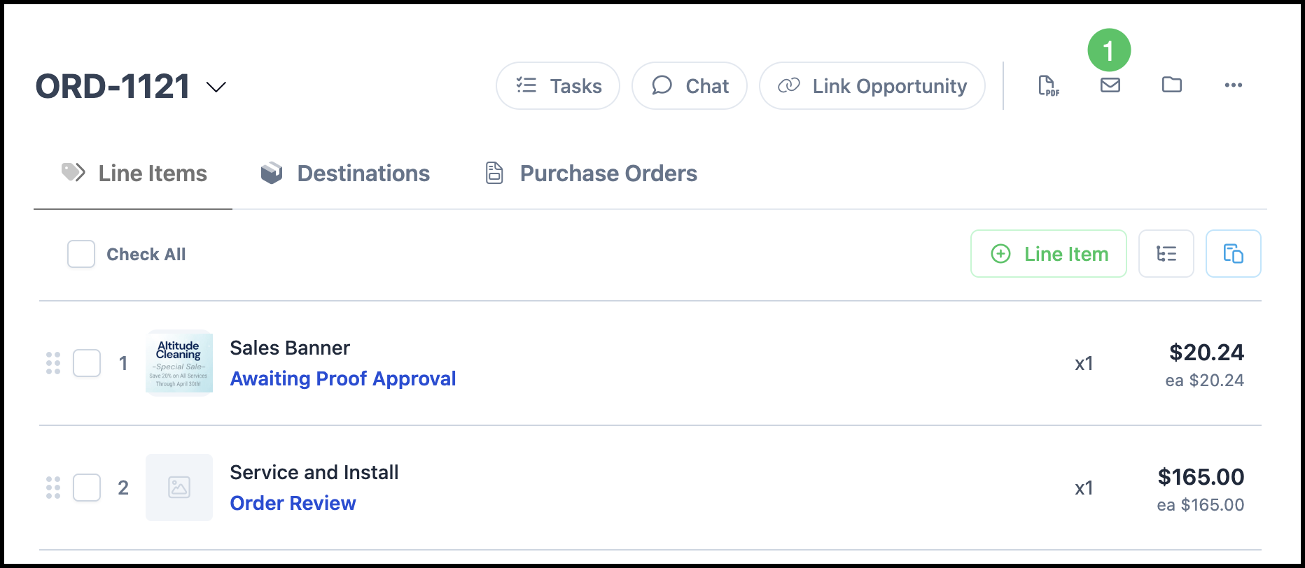 Once the Order is created, you can open it to review details, add additional Line Items, make updates, generate a PDF, email the Customer, or clone the Order for reuse. For more information, please see Orders Overview.