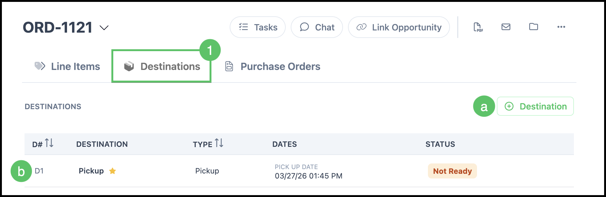 The Destinations tab shows how the product will be delivered or transported to the Customer (e.g., pickup, ship). Destinations represent delivery or workflow stages.
