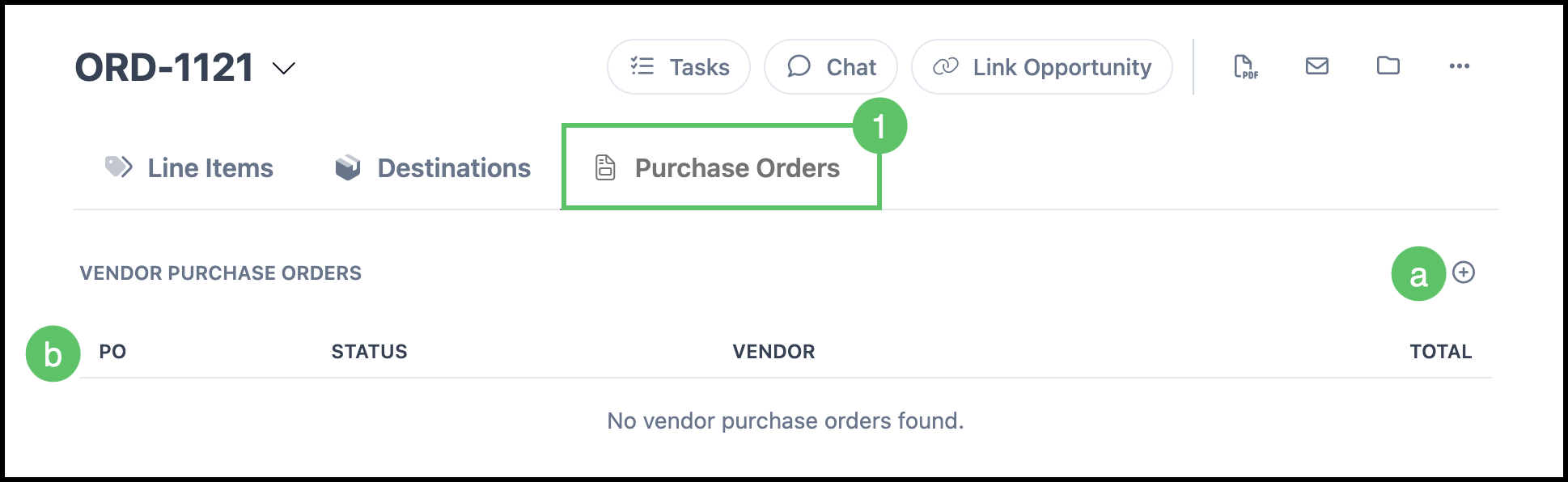 a. Use the add button (e.g., plus icon) in this tab to create a new Vendor Purchase Order for this Order when the option is available.