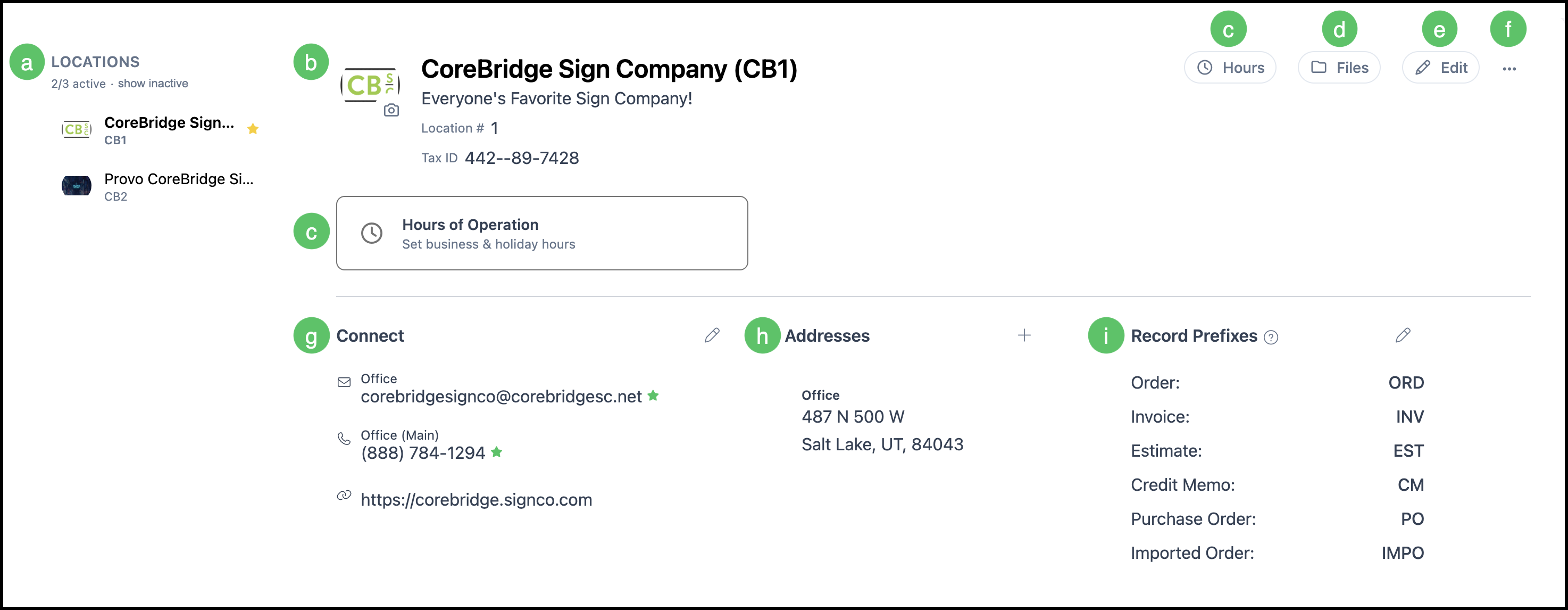 i. Record Prefixes - The characters that appear before record numbers for this Location, such as Order, Invoice, Estimate, Credit Memo, Purchase Order, and Imported Order. Prefixes can be edited by clicking the Edit icon in this field or by clicking the Edit button above to open the Company Details side panel.