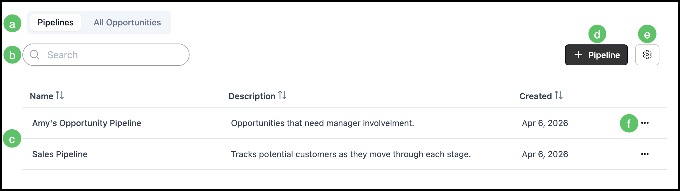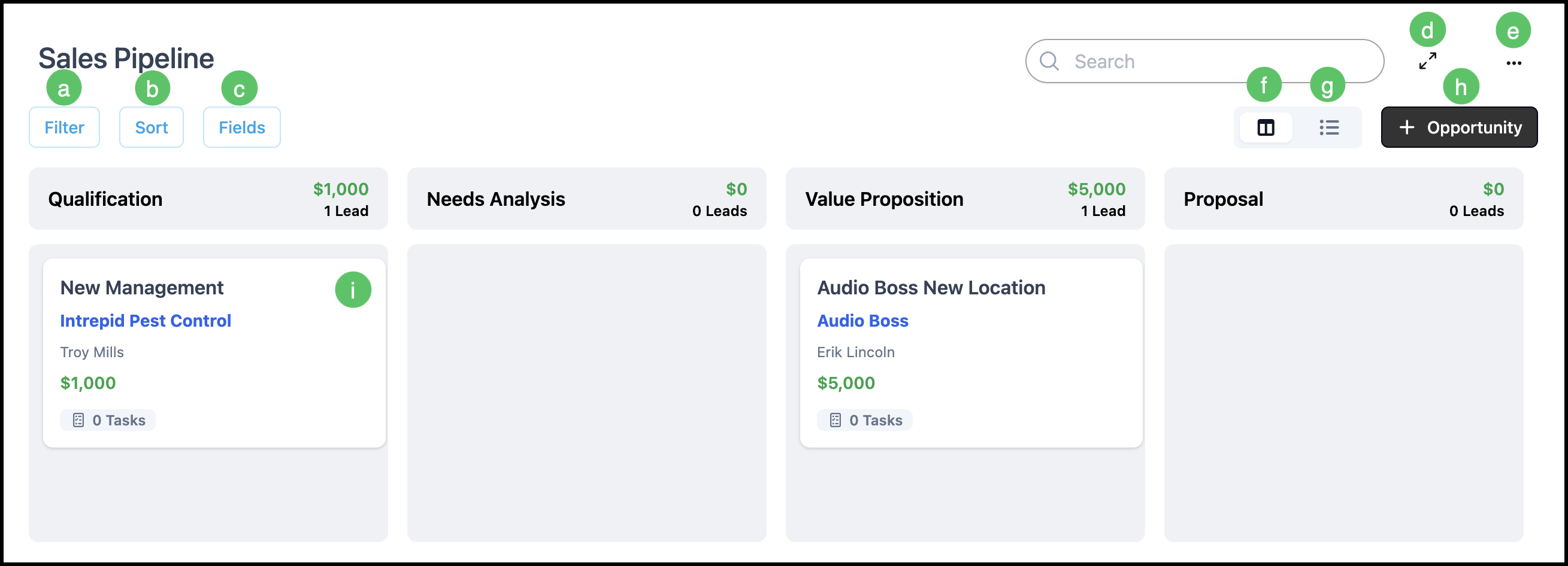f. Clicking here will display the Pipeline in Card View.
