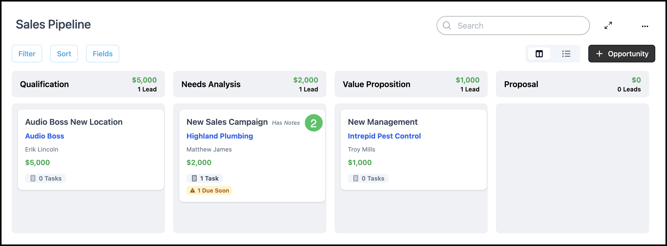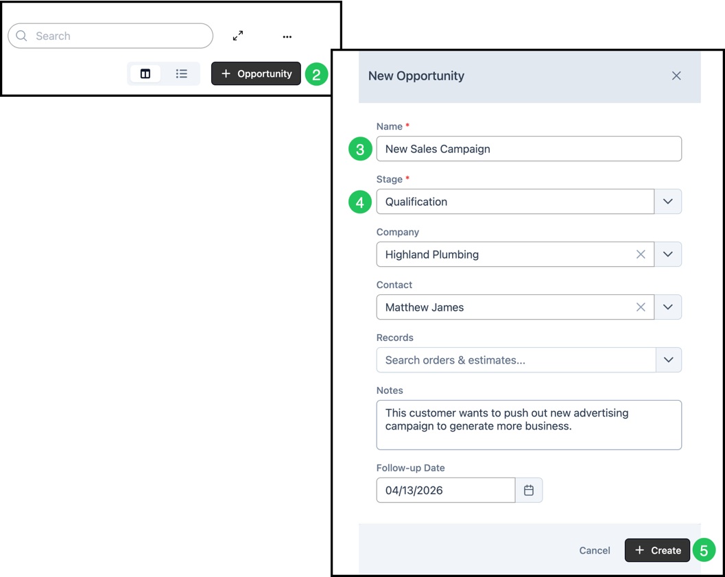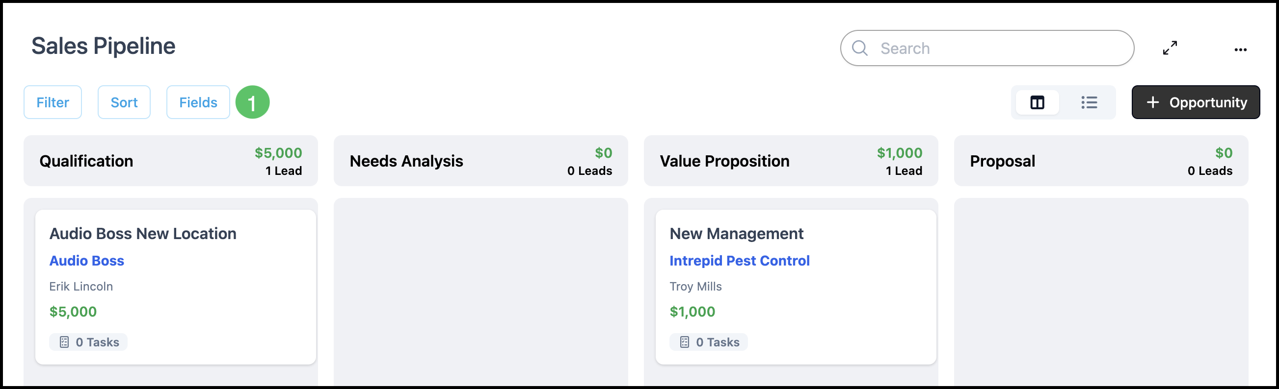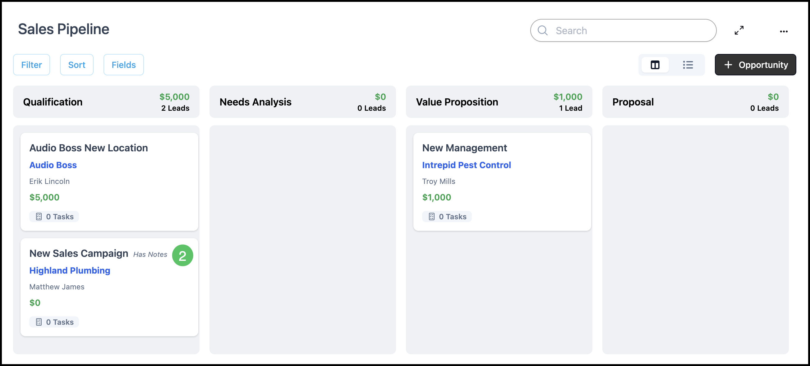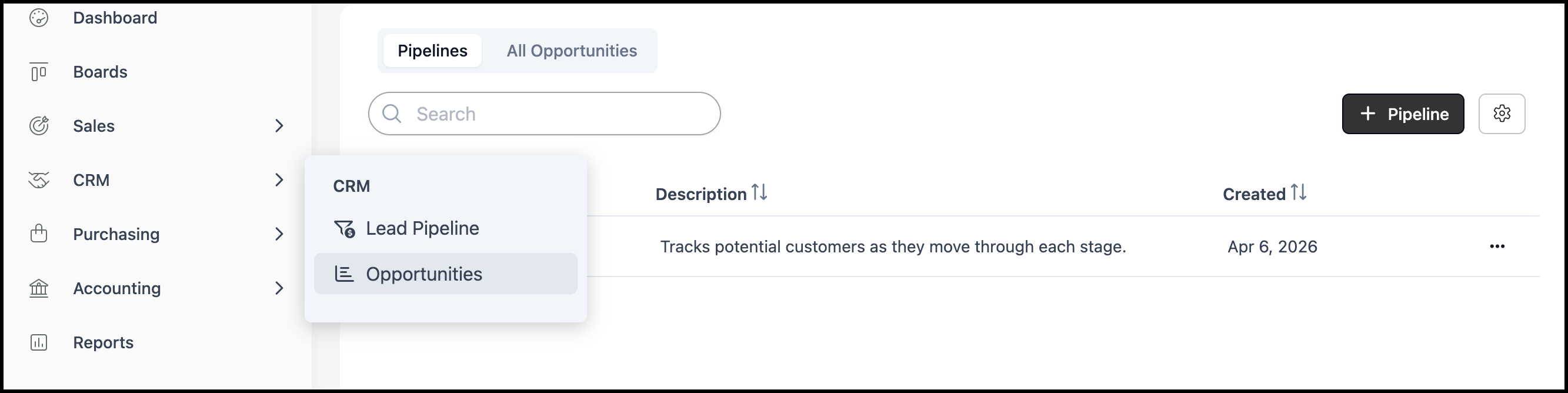 The Opportunities Pipeline gives you a visual way to track and manage potential sales from initial contact through close. Opportunities appear as cards on a board; each column is a Stage in your sales process. You can customize Stages, assign Estimates and Orders to an Opportunity, and move cards between stages manually. This article covers navigation, the board, adding Stages, adding Opportunities, linking records, and moving cards.
