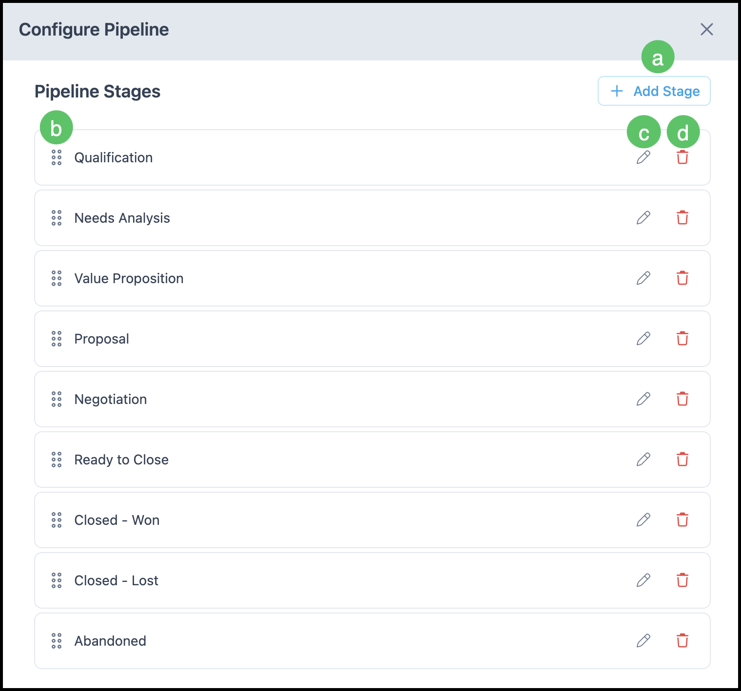 b. Stages can be reordered to match your workflow.