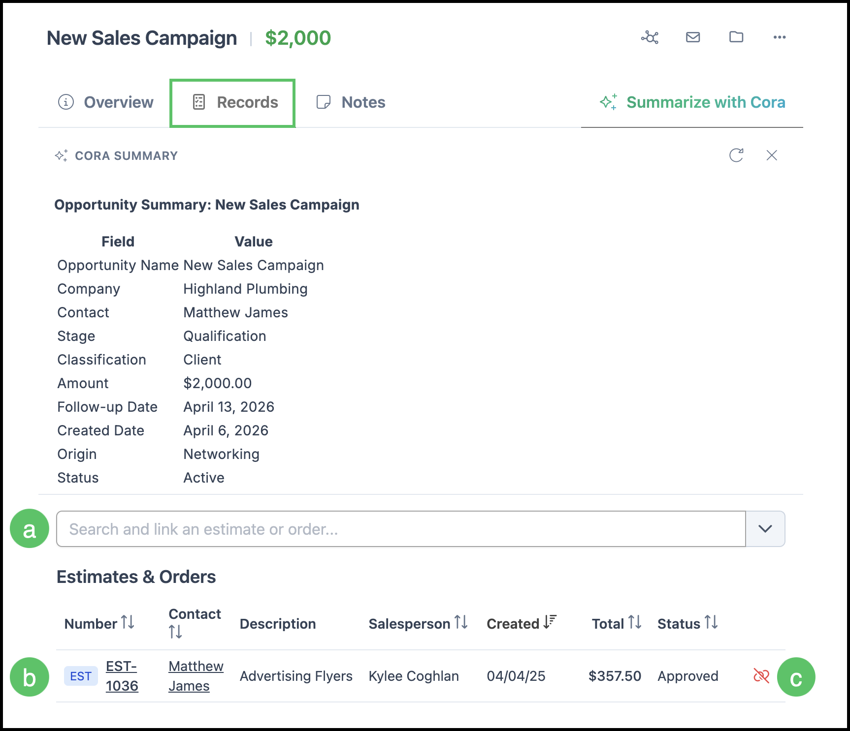 b. Clicking the Estimate Number will open up the Estimate. Clicking the Contact will open up the Contact page.