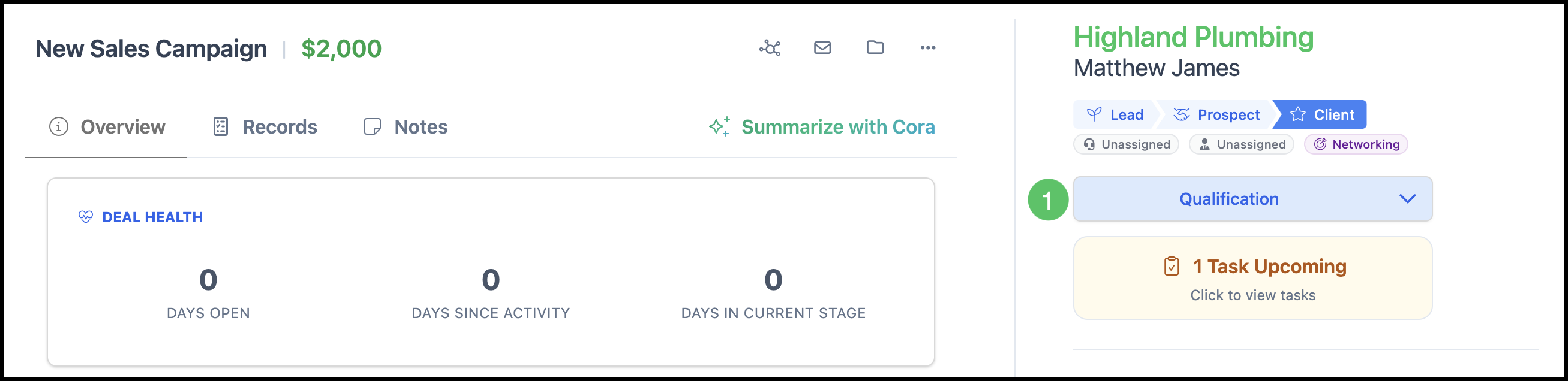 a. Deal Health shows the history of the Opportunity broken down by Days Open, Days Since Activity, and Days in Current Stage.